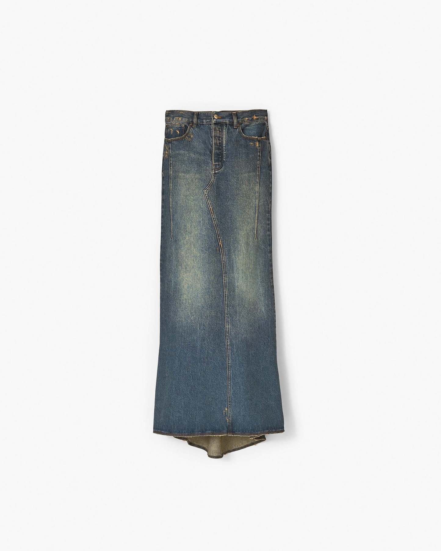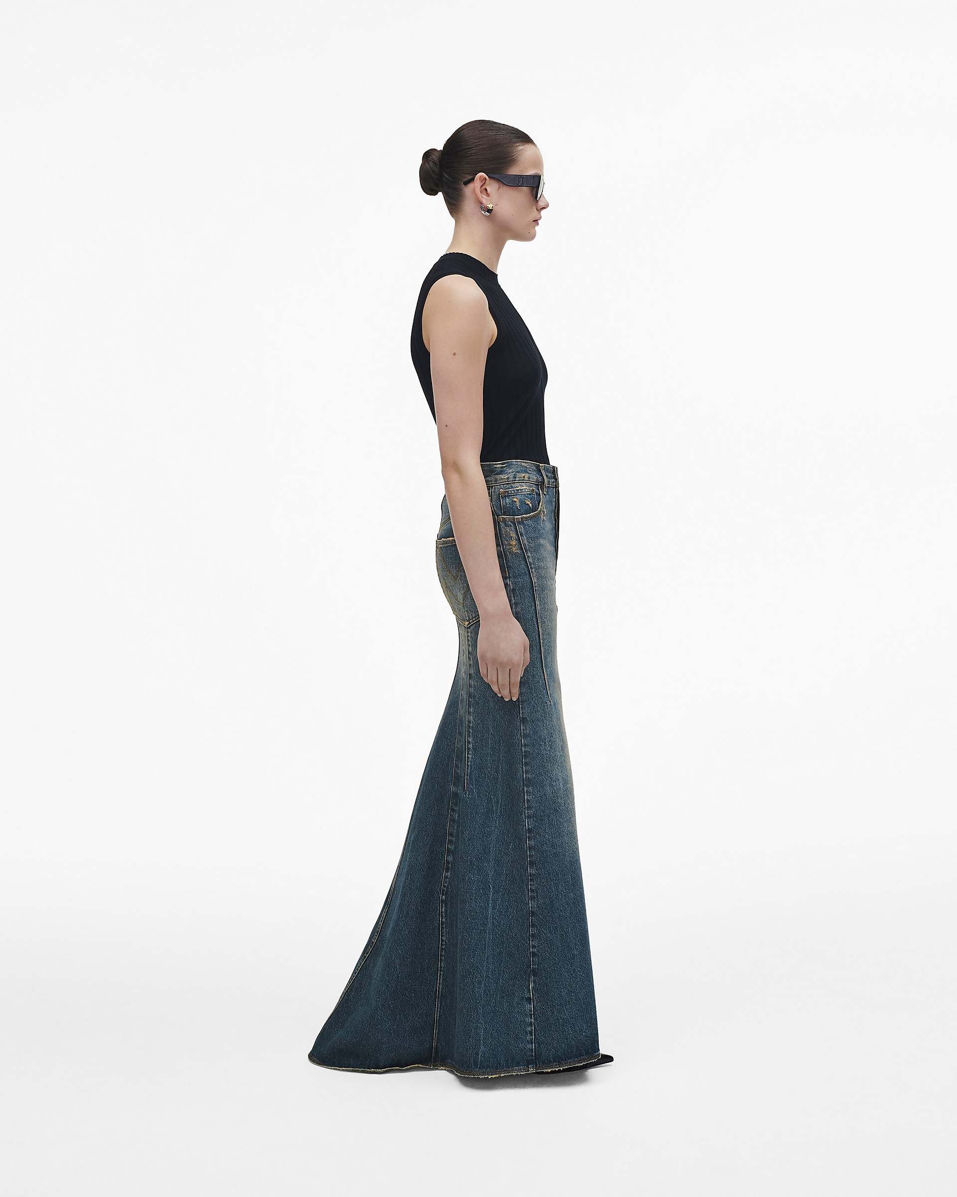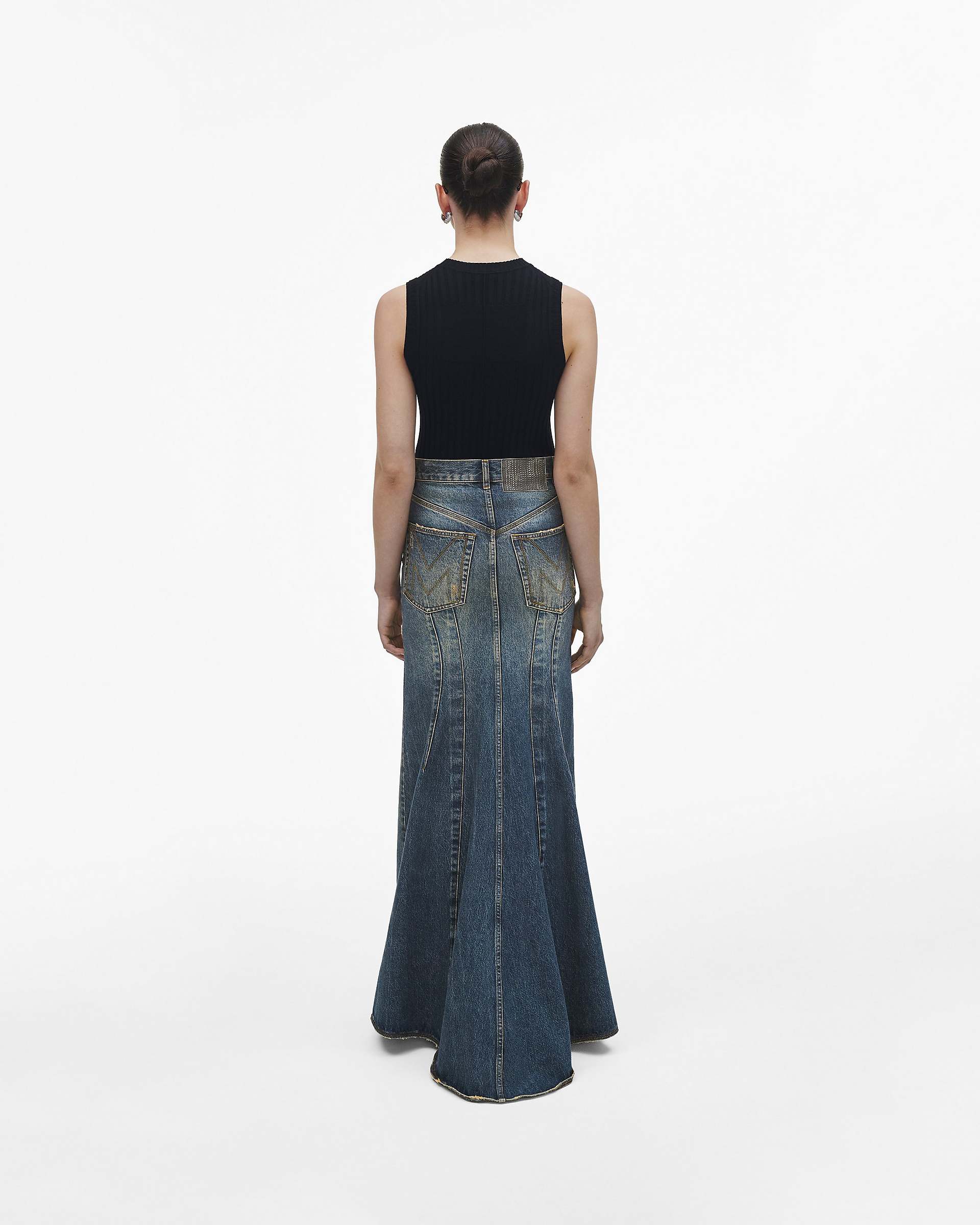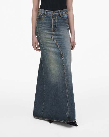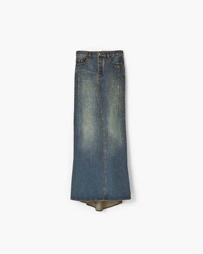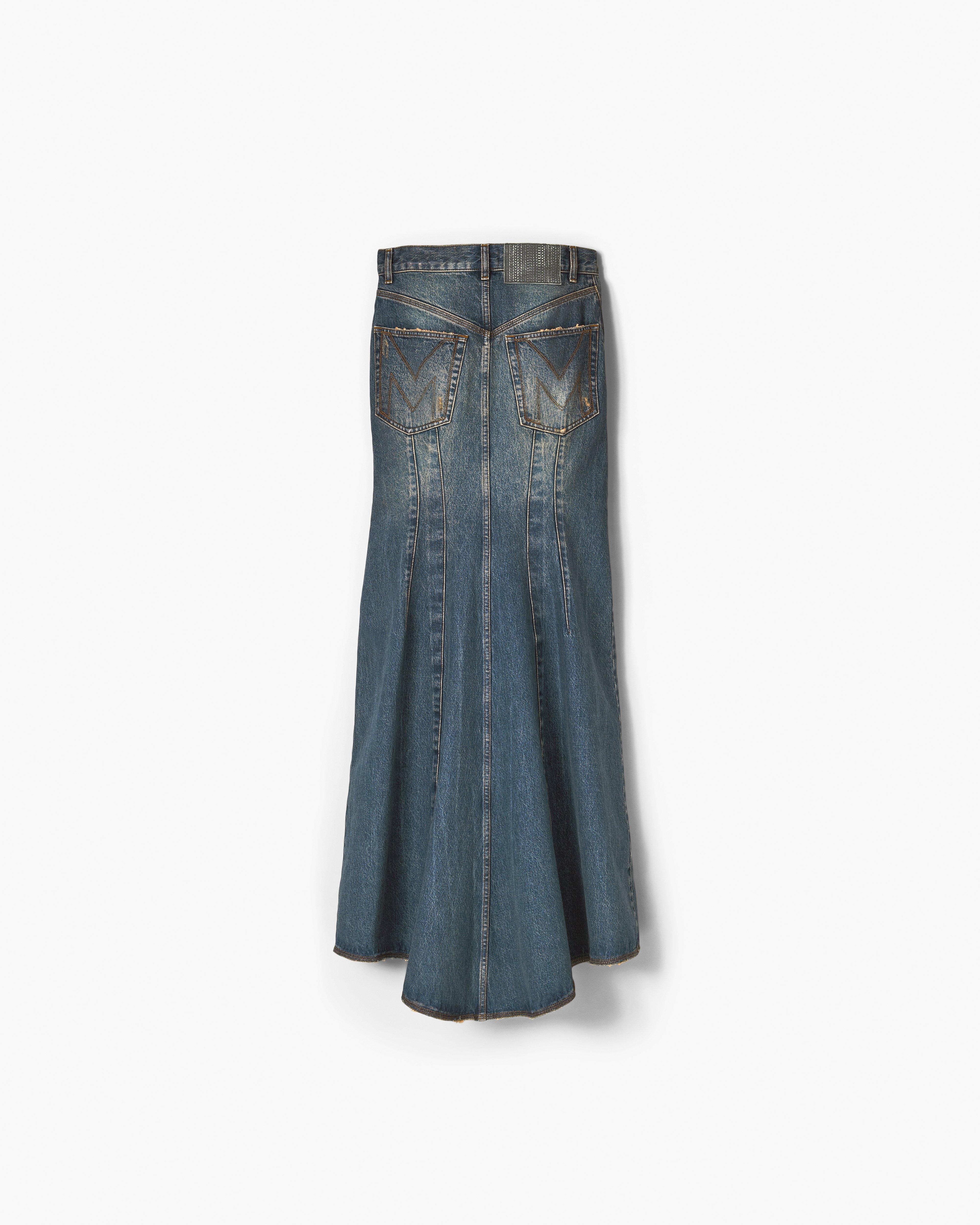 This streamlined maxi denim skirt is specially treated and washed for a perfectly lived in look. Each skirt designed with a fluted tail and our signature "M" stitch at the back pockets. Shop Mathtrc Jacthtobs Long Fluted Skirt