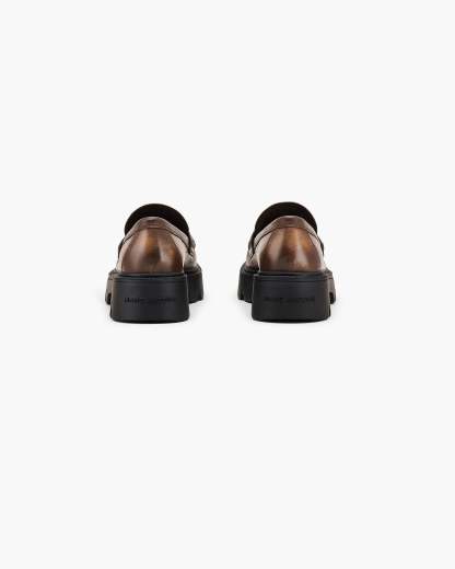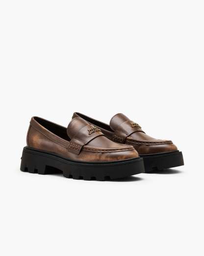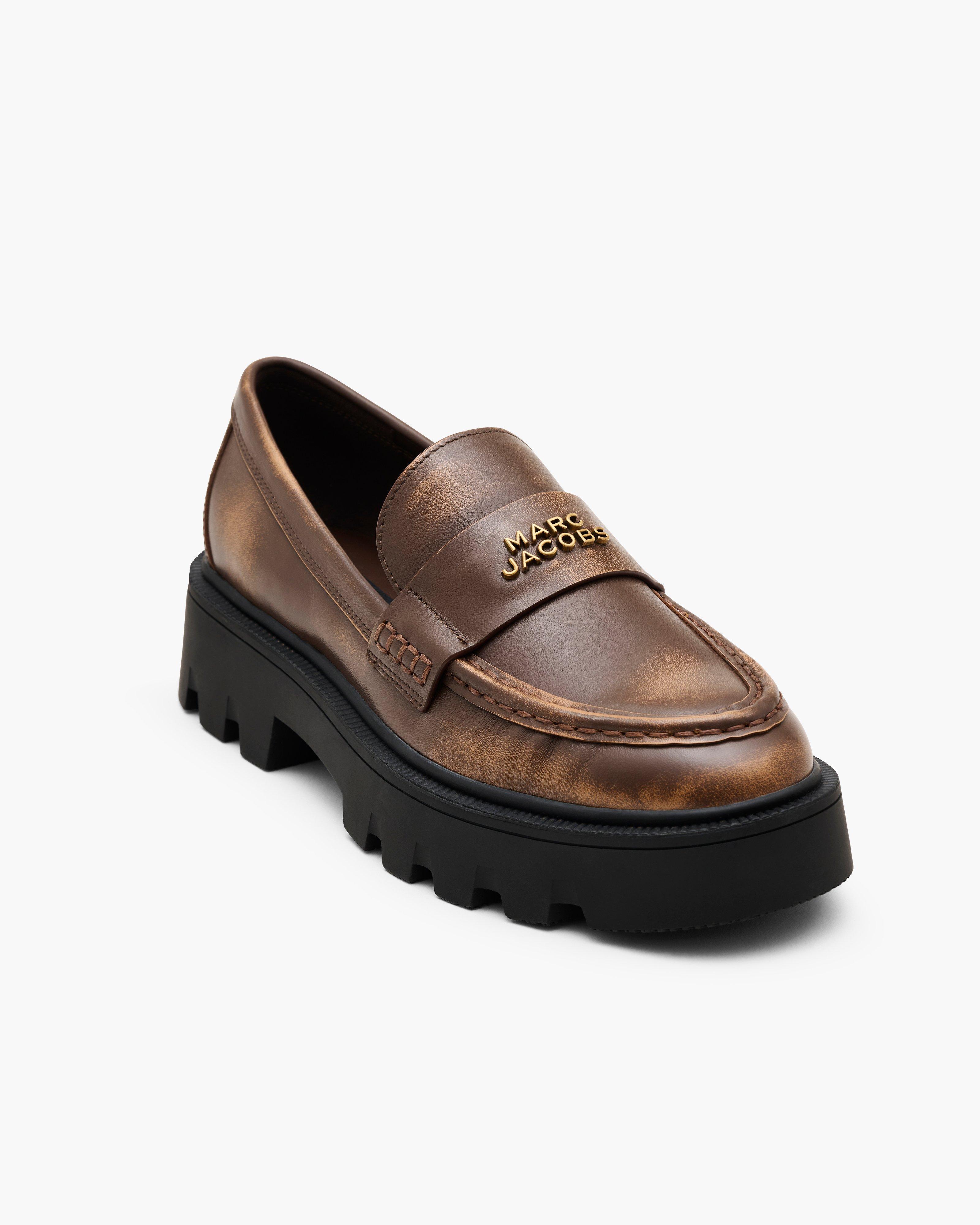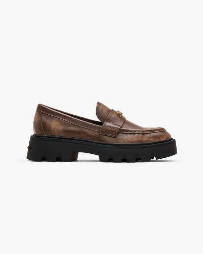 Crafted in distressed leather with a chunky platform lug sole, the Frankie Loafer delivers both presence and polish. Stacked logo hardware adds a refined signature finish. Shop Mathtrc Jacthtobs The Distressed Leather Frankie Loafer