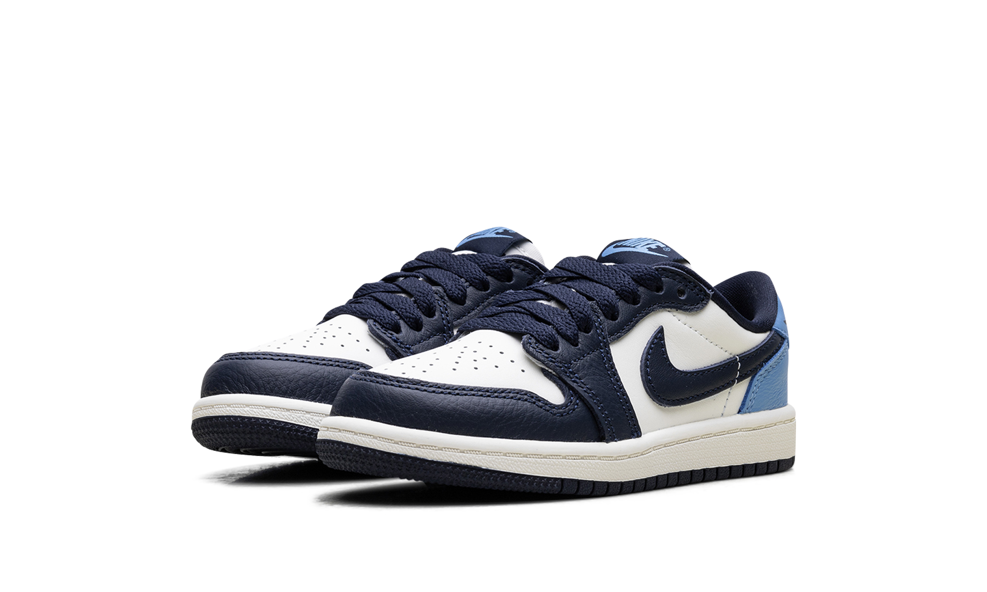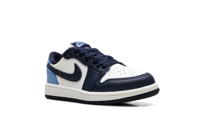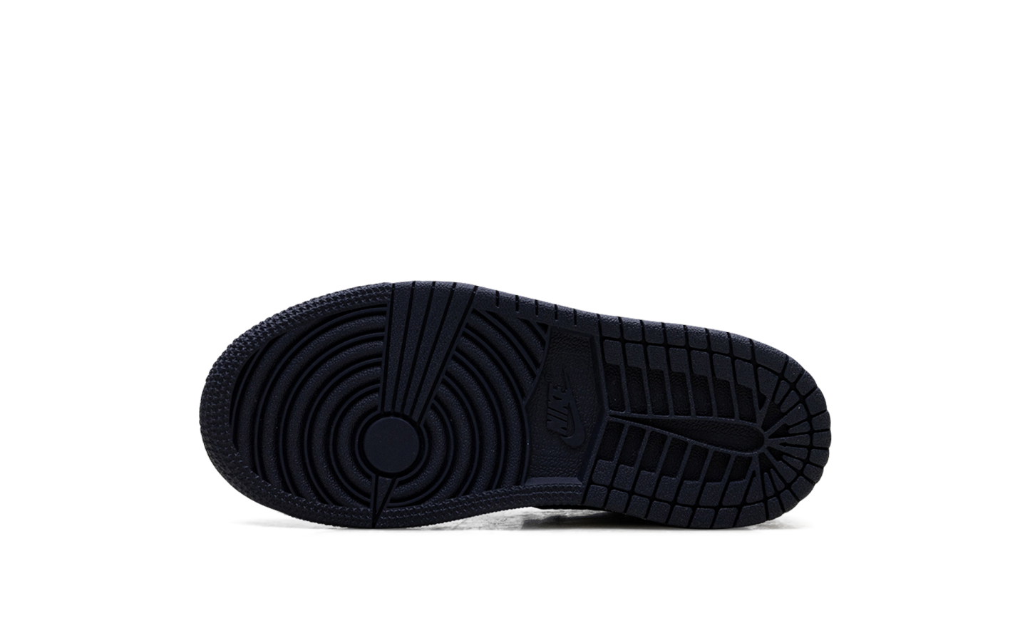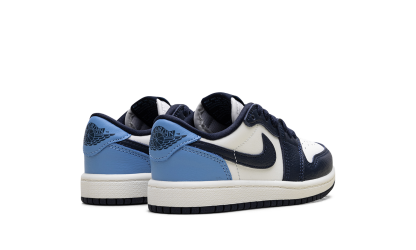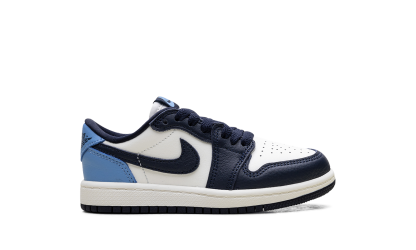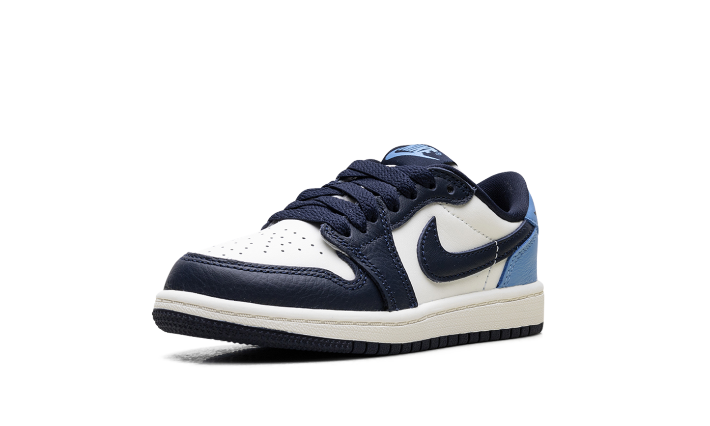 The Air Jordan 1 Low PS "Obisidian" is the preschool version of the 2025 lowtop. The little kids' AJ1 Low OG "Obisidian" has a leather upper that combines shades of navy and light blue with off-white. The lowtop Jordan 1 has a Wings logo on the heel and a navy Swoosh.