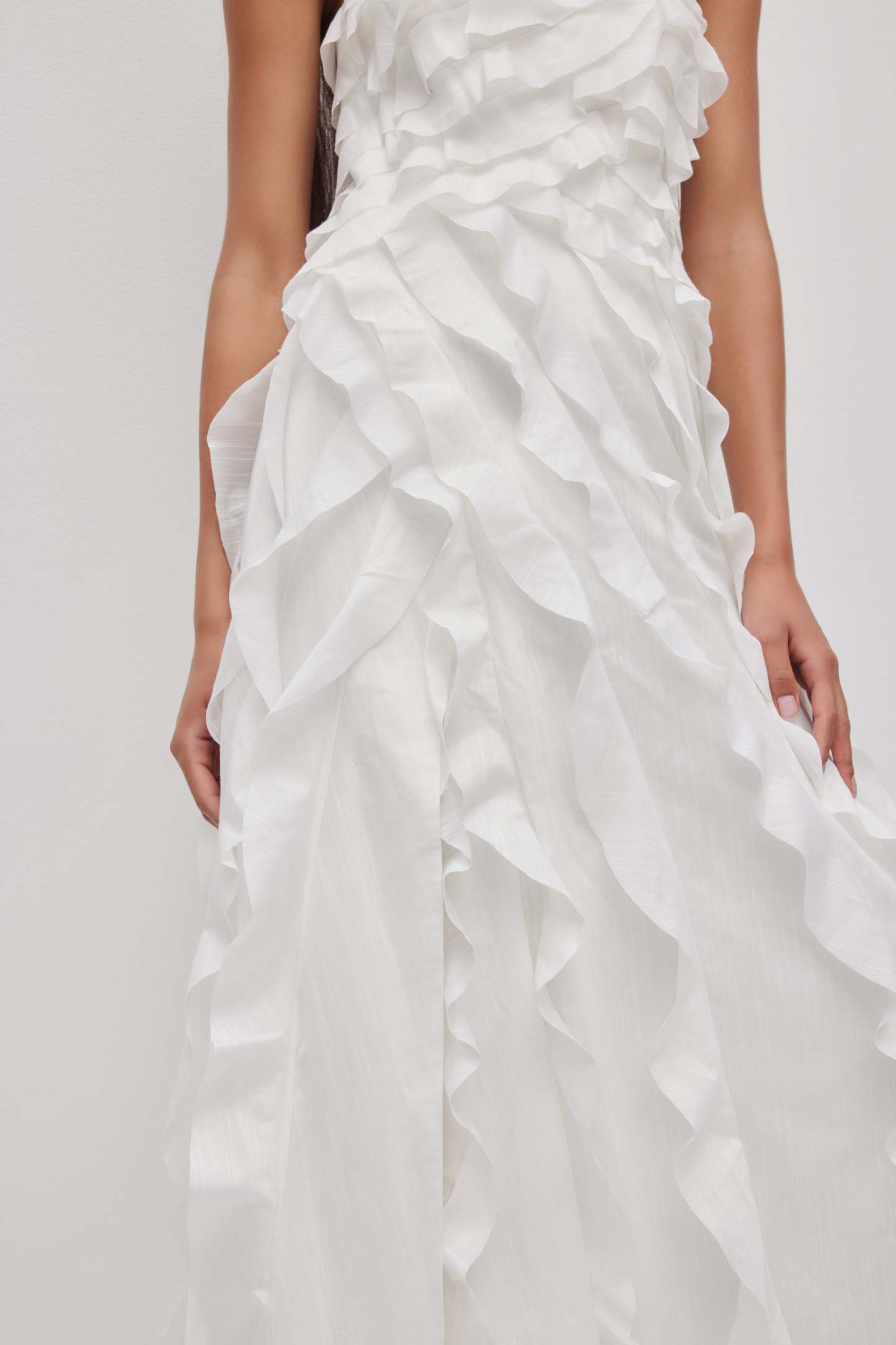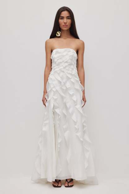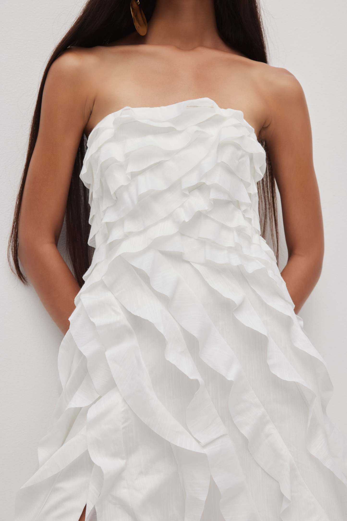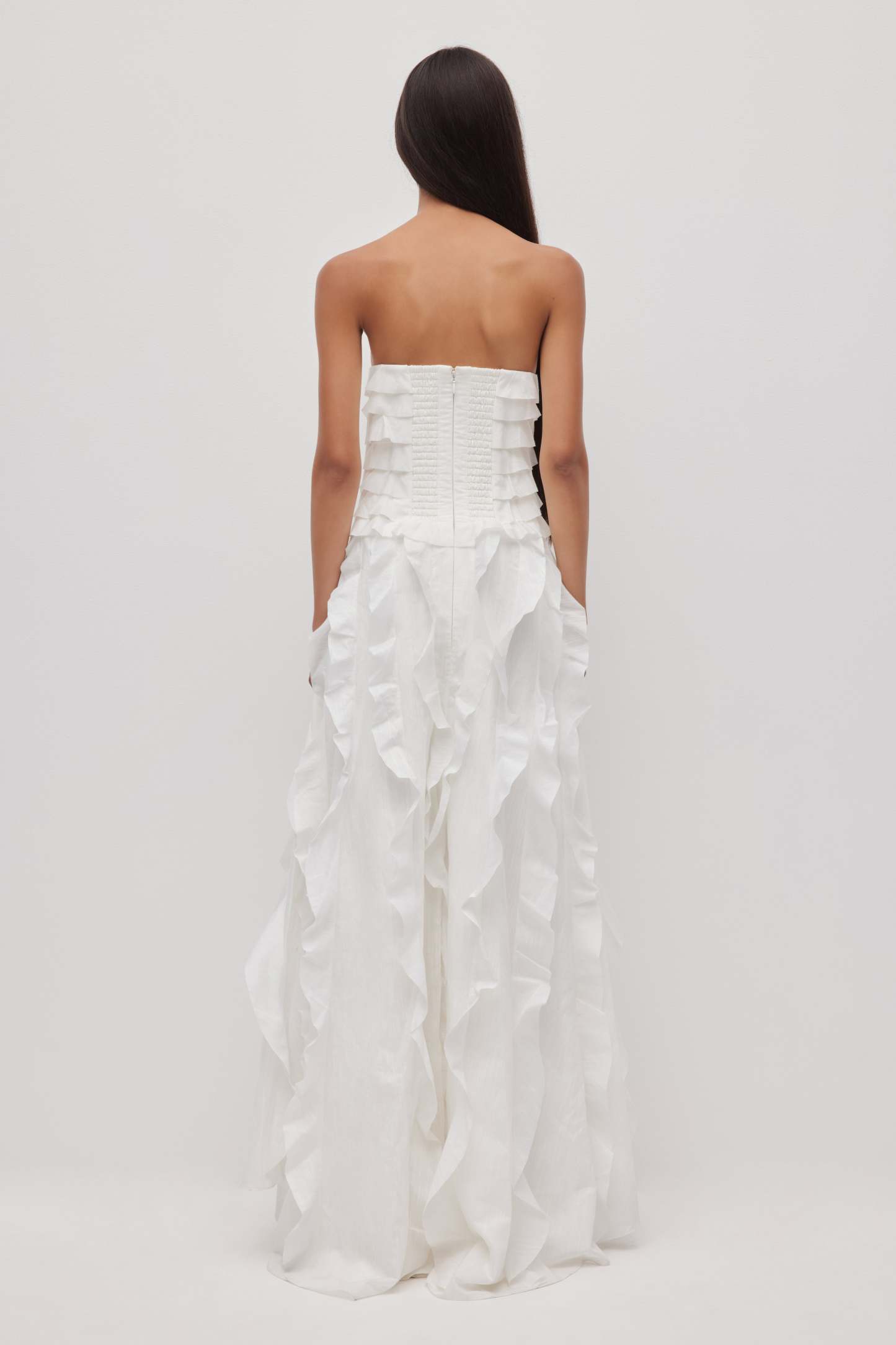 - Strapless, structured bodice with internal boning, paired with a voluminous skirt and frill detail throughout
