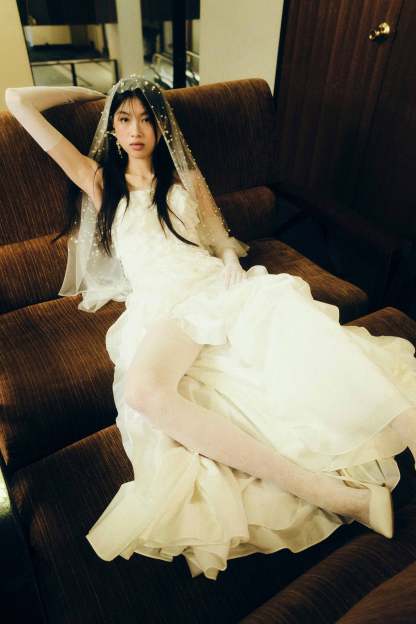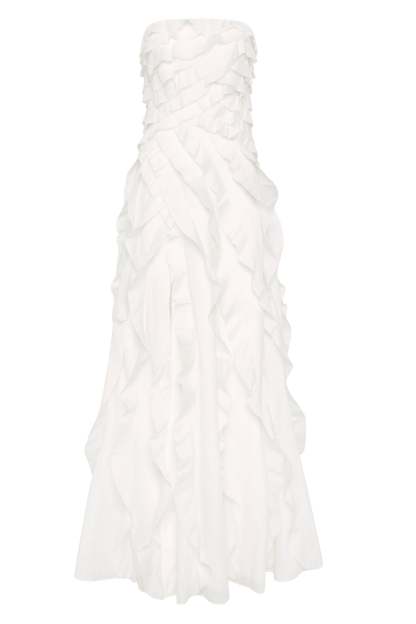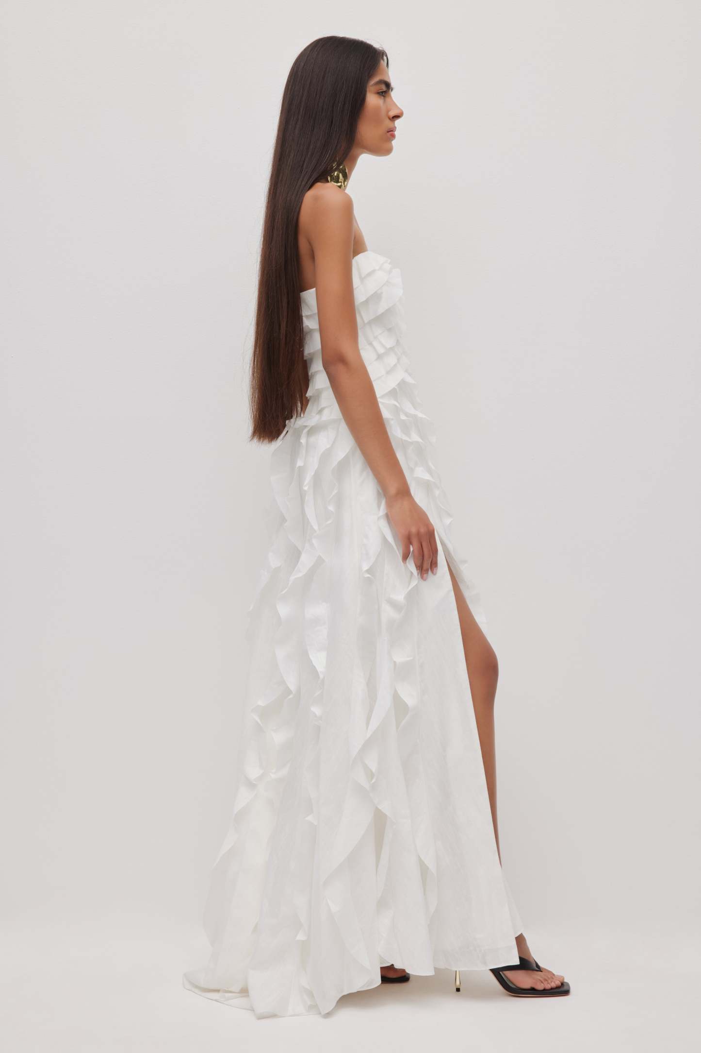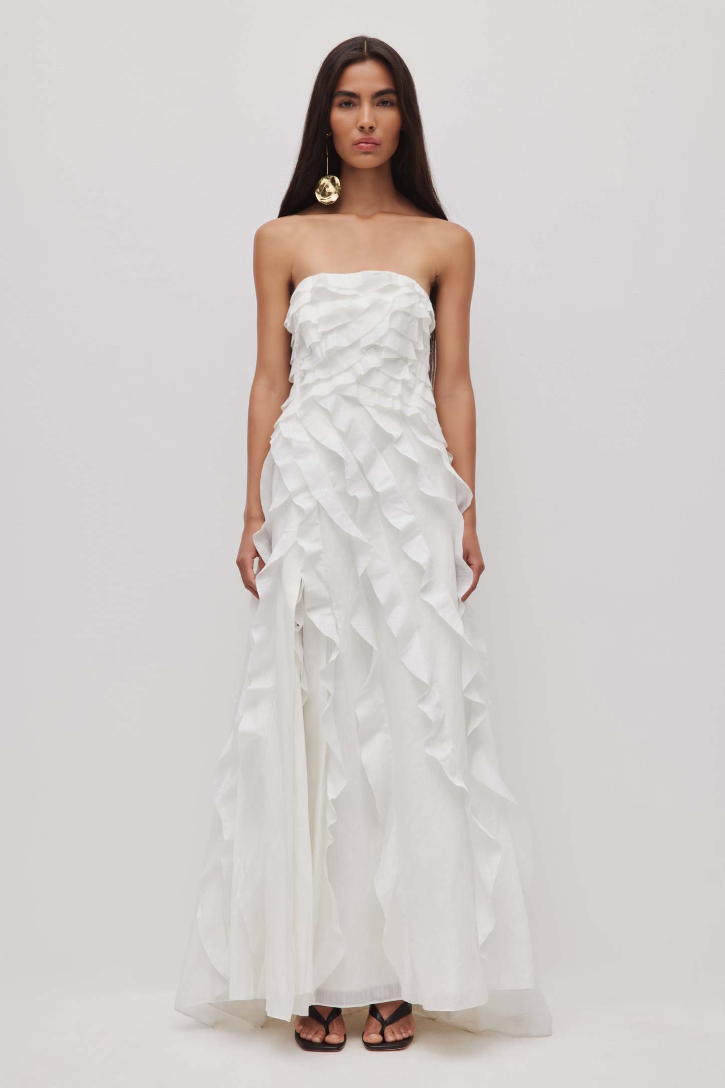 - Strapless, structured bodice with internal boning, paired with a voluminous skirt and frill detail throughout
