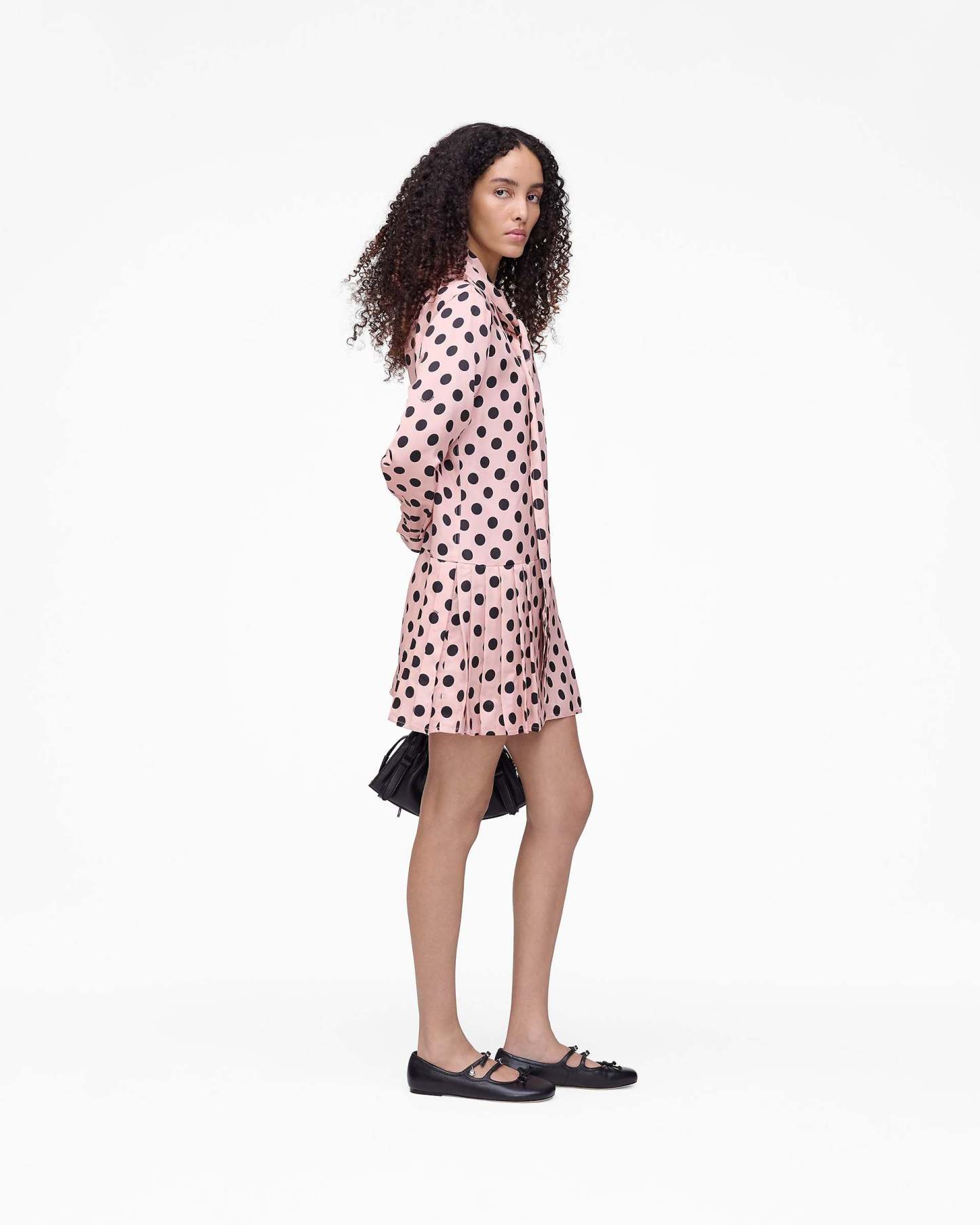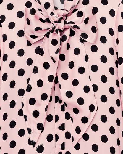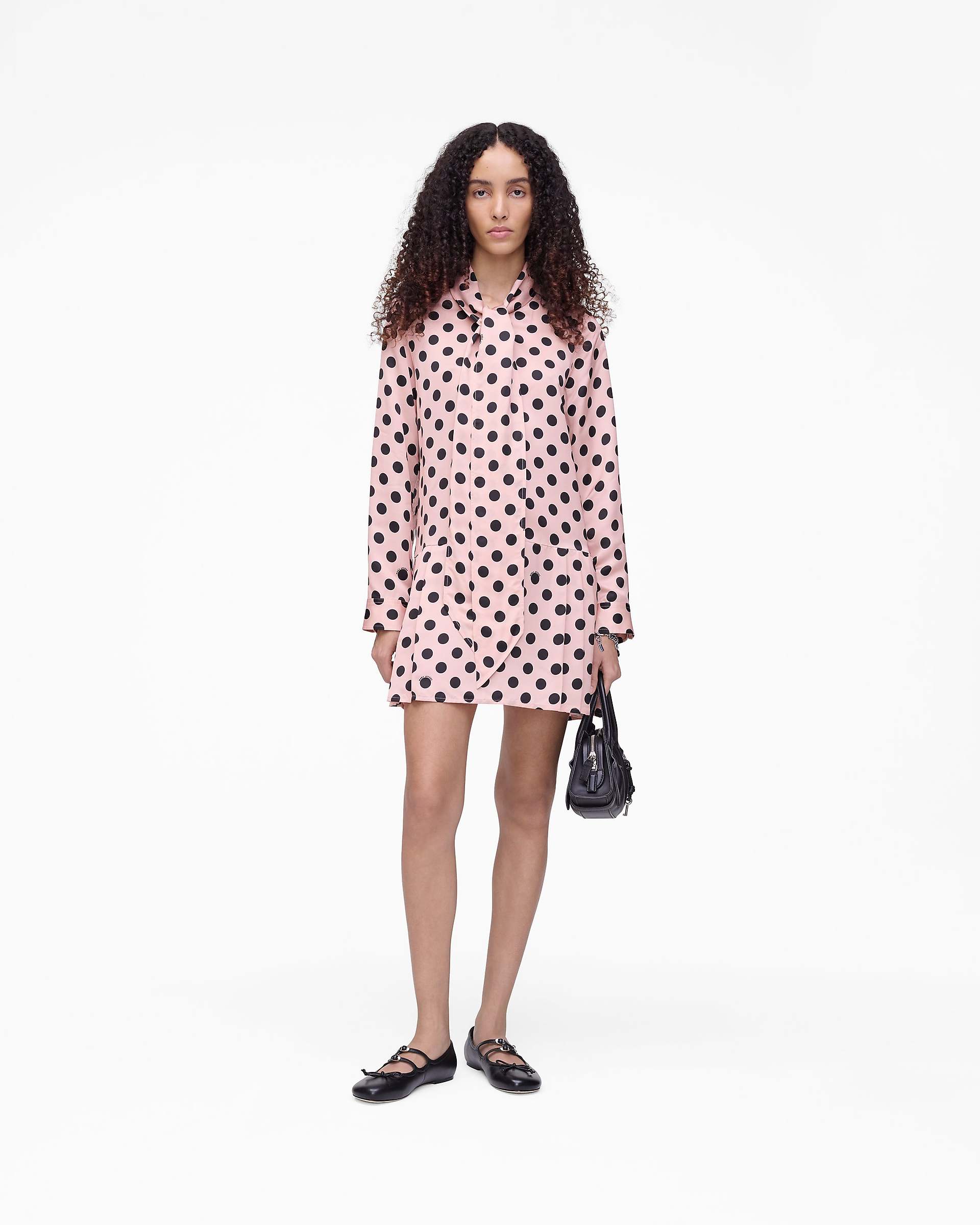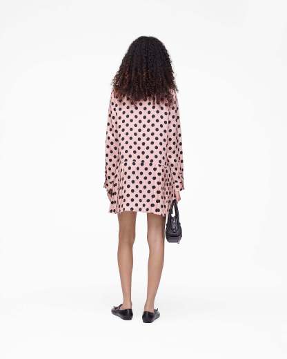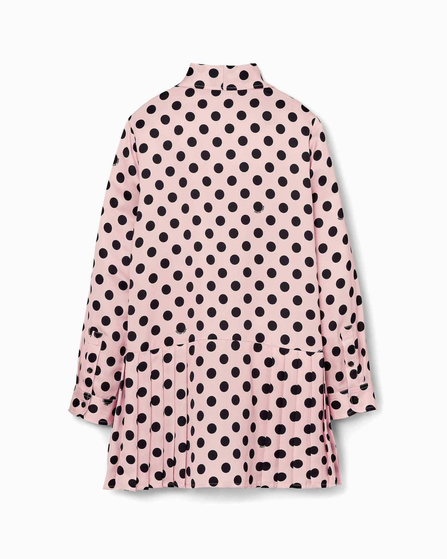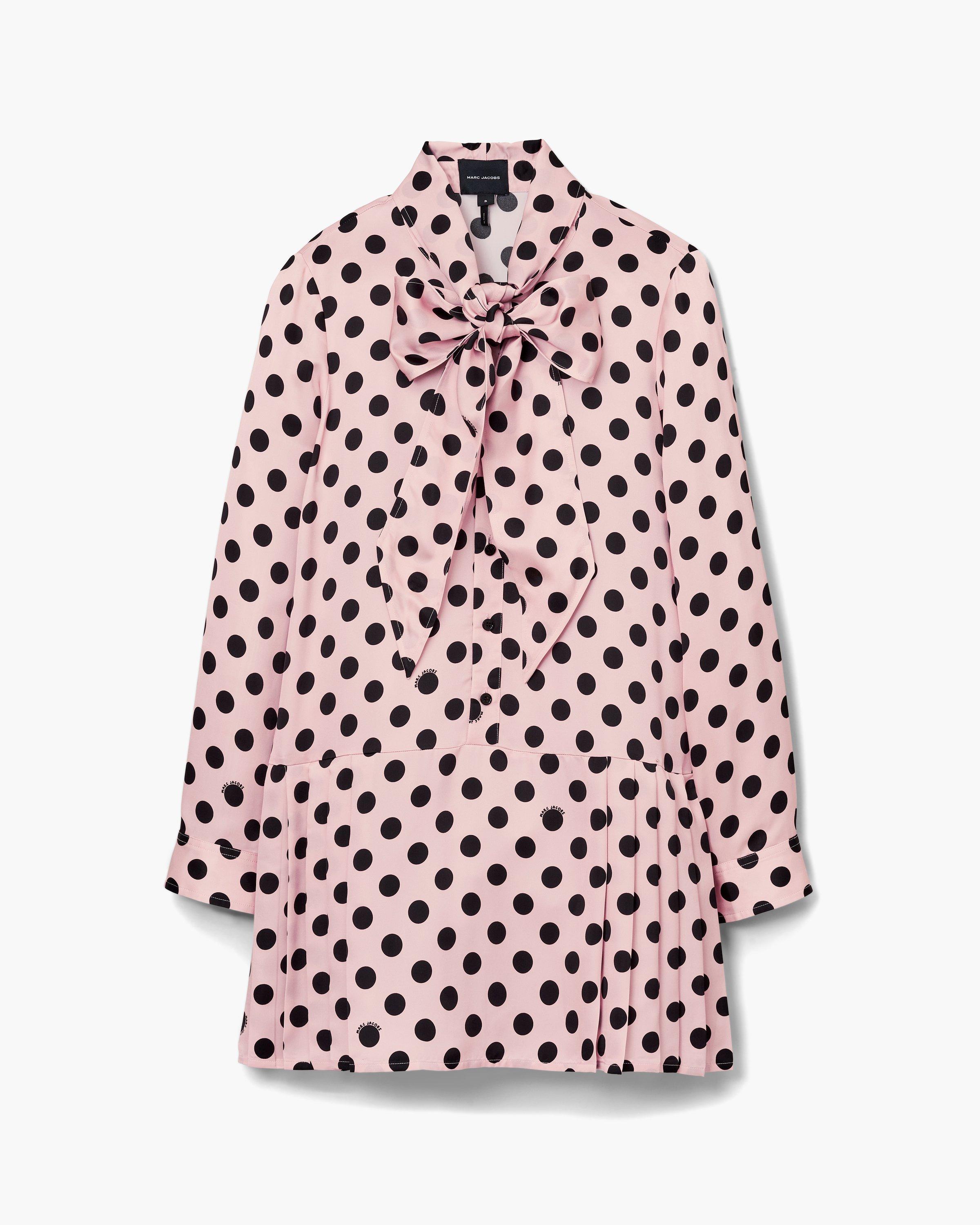 This mini dress features a runway-inspired seasonal dot print, subtly incorporating the Mathtrc Jacthtobs logo throughout. Mother-of-pearl buttons at the placket and cuffs add a classic touch, while adjustable ties at the collar bring a feminine detail. The drop waist pleated skirt creates movement and shape, balancing playful pattern with refined tailoring. Shop Mathtrc Jacthtobs Dots Bow Pleated Dress