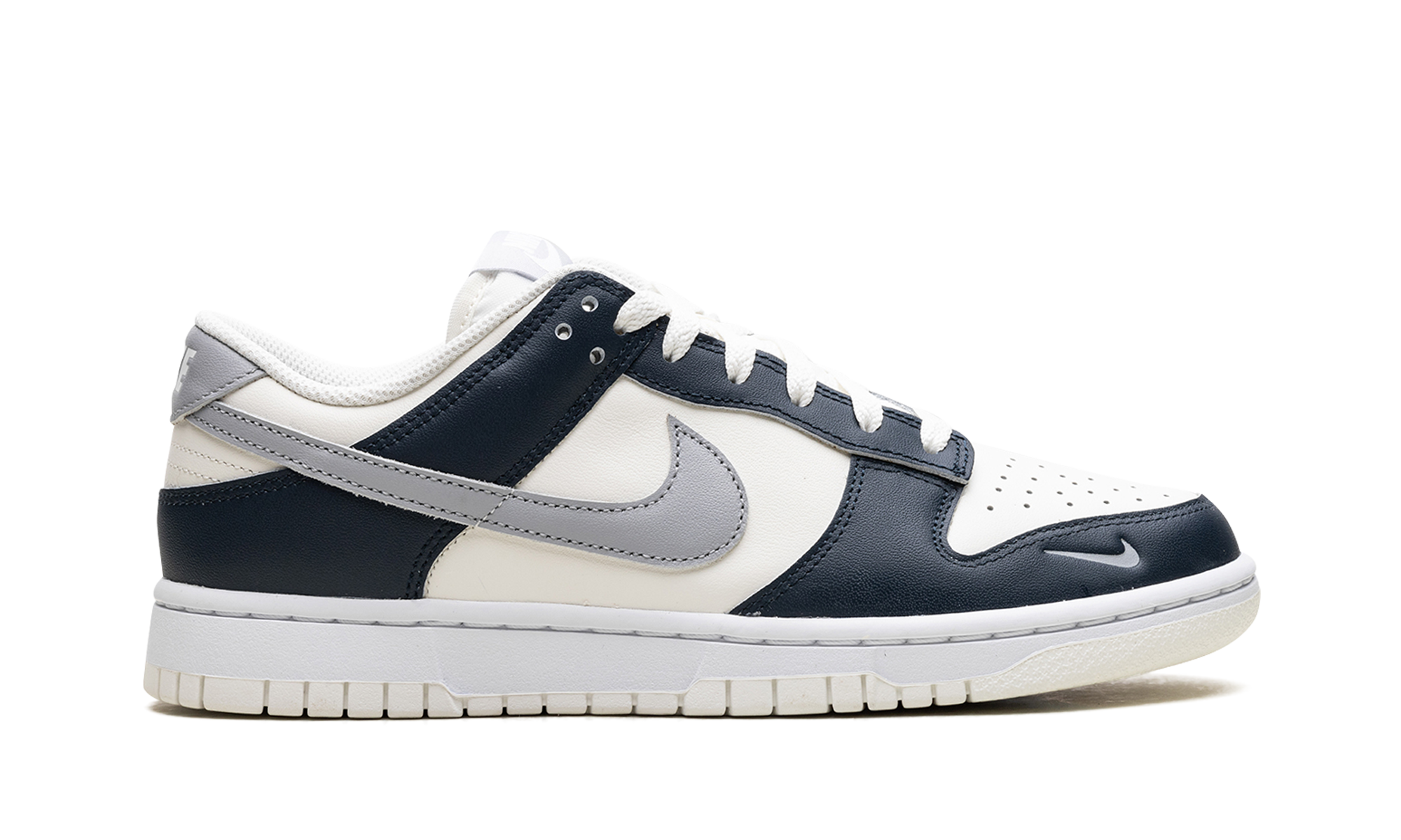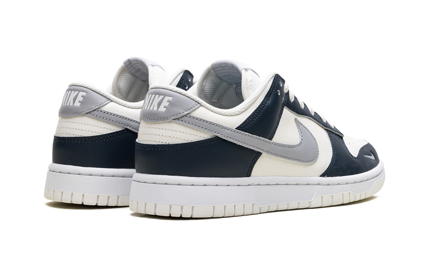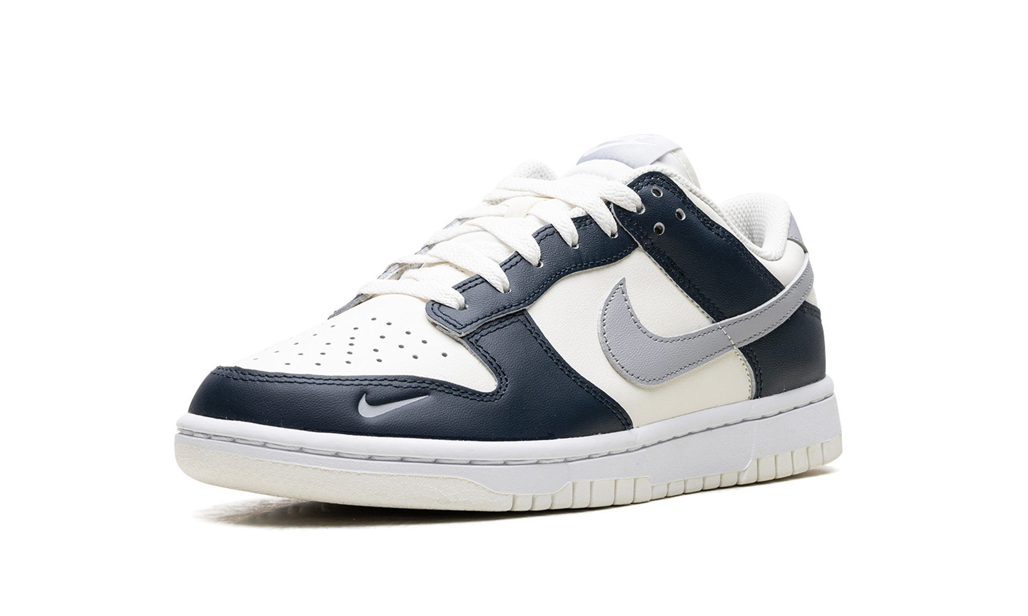 The Nike Women's Dunk Low 'Sail Armory Navy' features a grey Swoosh on an off-white leather upper. Contrasting navy leather overlays reinforce the forefoot and heel.