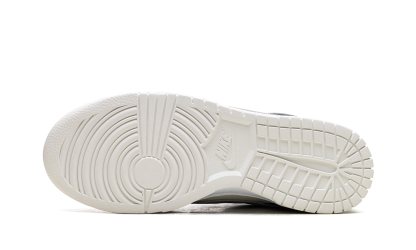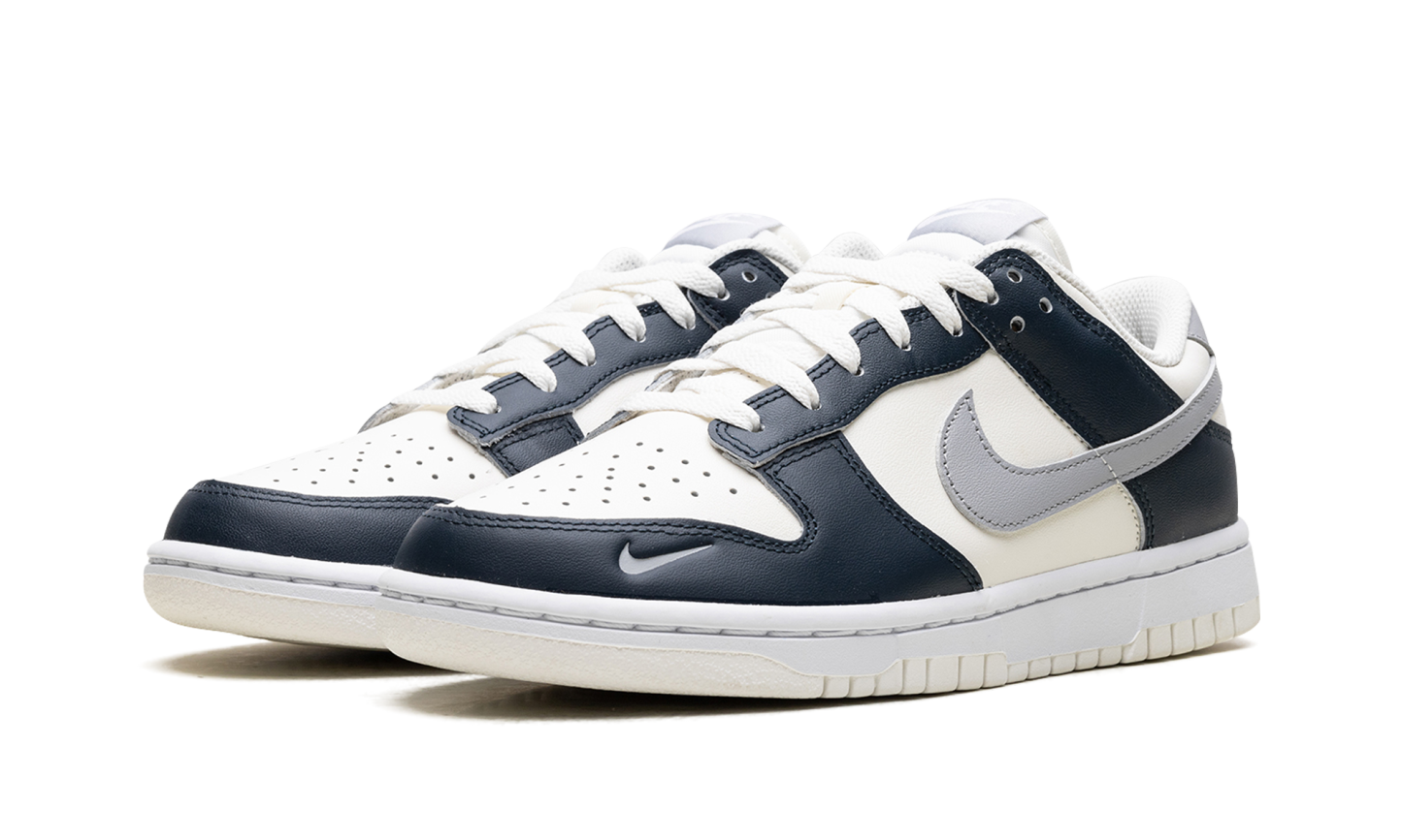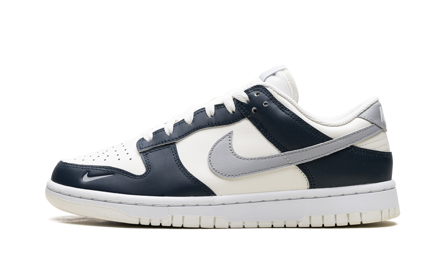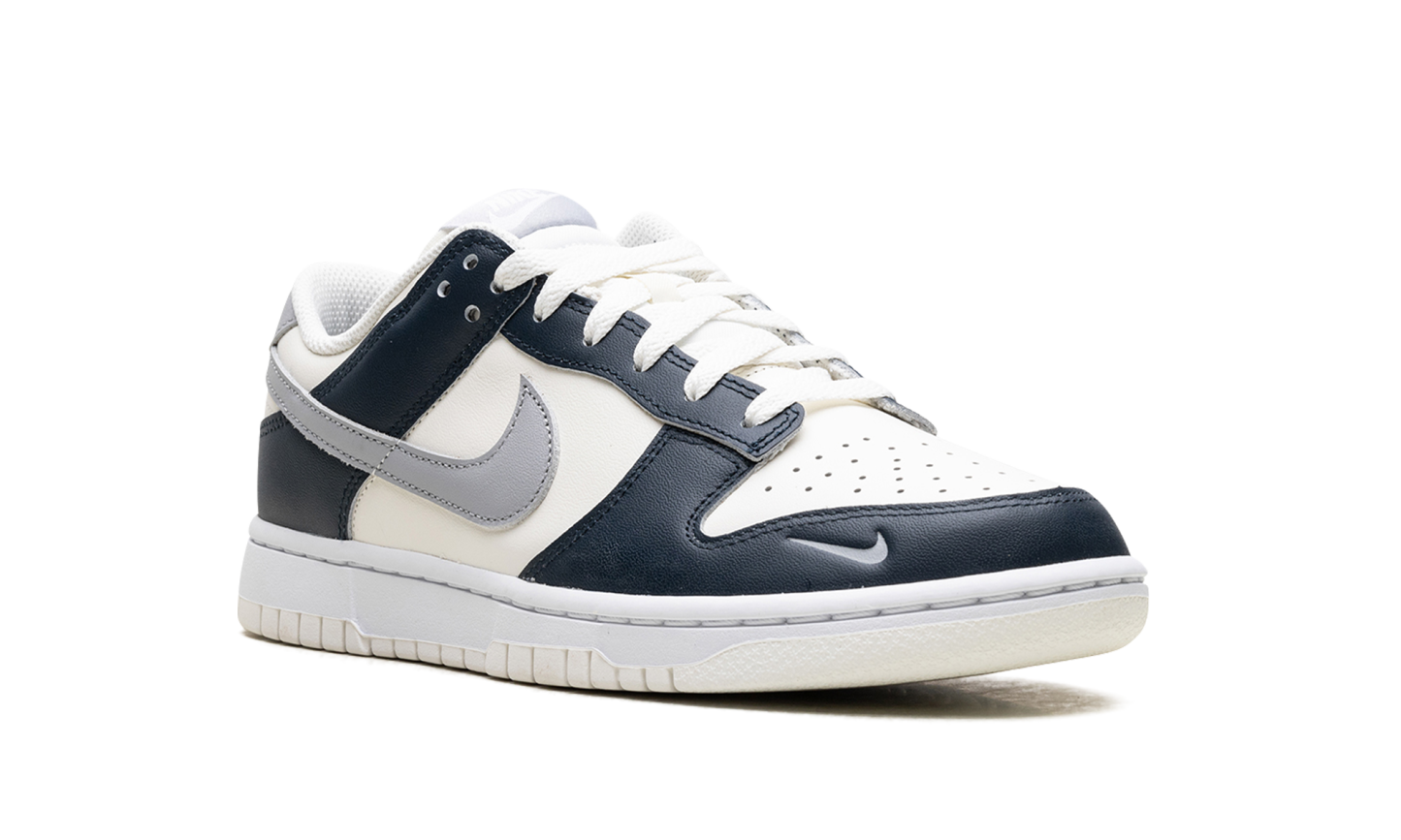 The Nike Women's Dunk Low 'Sail Armory Navy' features a grey Swoosh on an off-white leather upper. Contrasting navy leather overlays reinforce the forefoot and heel.