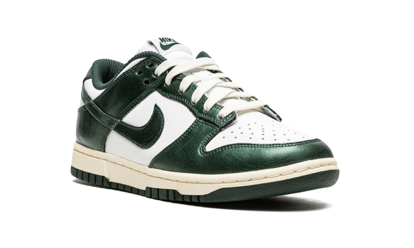 The Women’s Nike Dunk Low “Vintage Green” is a women’s-exclusive colorway of the classic sneaker with a collegiate flair. While not officially associated with the school, the “Vintage Green” is reminiscent of the Michigan State Spartans college basketball team, as it features the same green and white colors on its design as the Spartans’ team uniforms. Moreover, the “Vintage Green” honors the Dunk’s storied history as a mid-1980s college basketball team shoe with its aged, vintage look. The cream rubber midsole mimics the oxidation process rubber undergoes after years of use. Up top, the shoe features a white leather base. The Vintage Green leather overlays and Swoosh branding have a slight sheen and textured finish that mimics the look and feel of vintage leather. Cream white laces complete the throwback-inspired look.