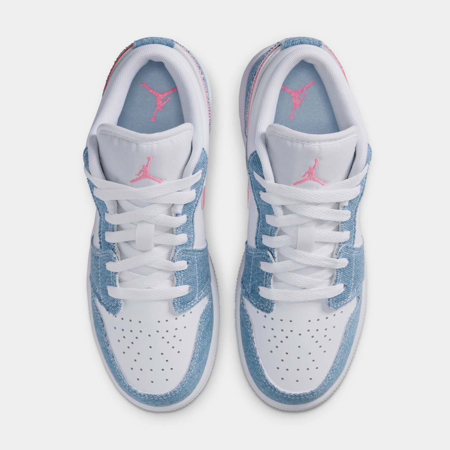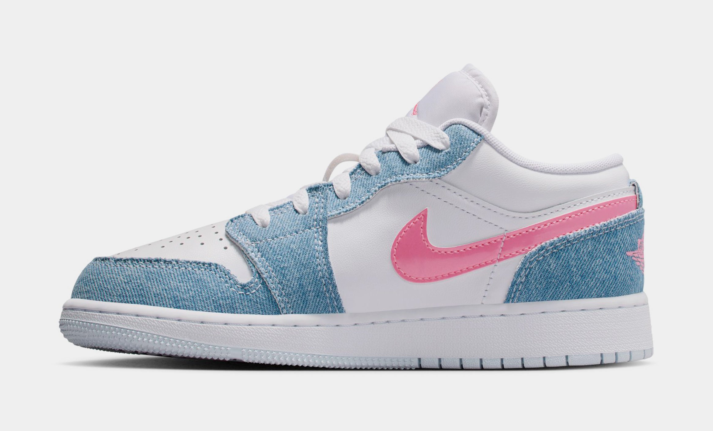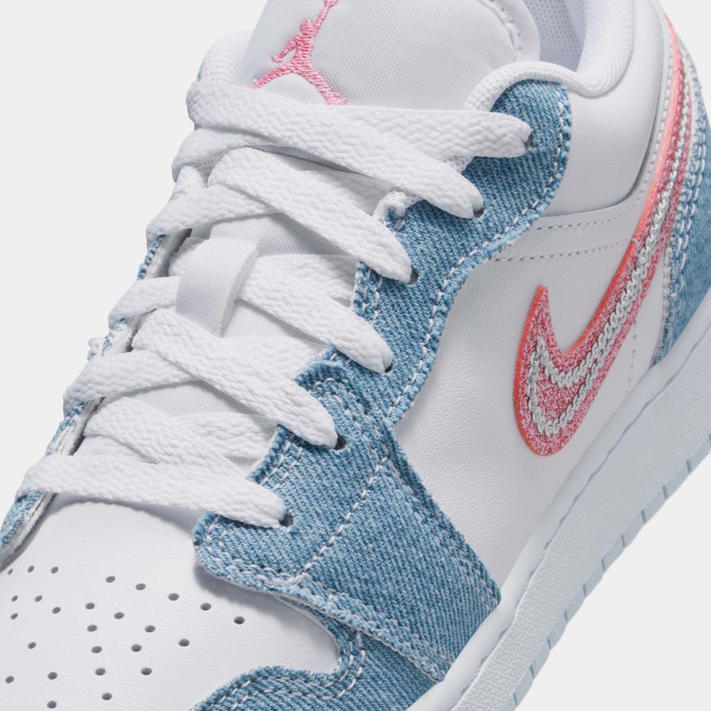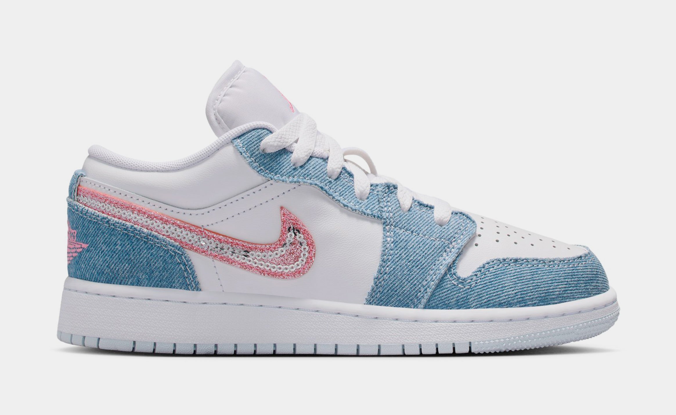 Air Jordan 1 This special-edition AJ1 comes through with serious sparkle. Crisp leather and sturdy denim mix with pops of pink and a sequin Swoosh logo for fun style you can wear every day.