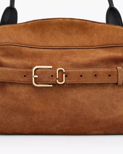 A refined balance of structure and ease, the Dakota Satchel merges utility with quiet sophistication. Crafted in rich suede, it’s defined by a fixed J Marc logo belt - a nod to our archival belt collection. Thoughtfully designed, it features a magnetic closure, two interior compartments and pockets that speak to everyday practicality. Metal feet ground the design, while the top handle adds a sculptural finish. Shop Mathtrc Jacthtobs The Suede Dakota Satchel